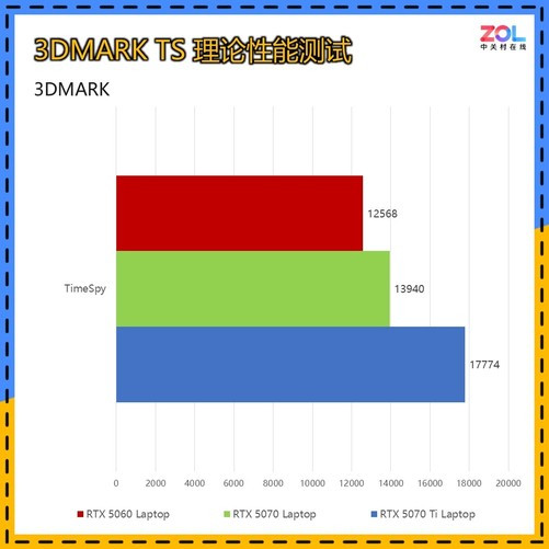 首先是理论性能测试,测试软件为3DMARK。在代表DX12性能的TimeSpy中,具体成绩如下。性能提升方面,移动版RTX5070相比移动版RTX5060提升10.9%,这个幅度大家不会陌生,RTX40系中的50、60、70之间的提升幅度就是10%左右。而移动版RTX5070Ti相比移动版RTX5070,提升幅度来到27.5%,明显拉开了性能差距。