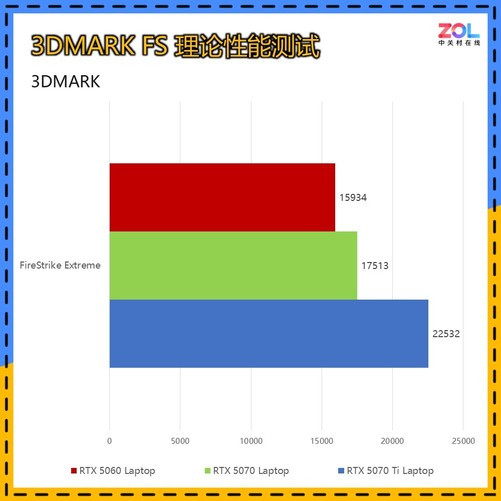 在代表DX11性能的FireStrikeExtreme中,具体成绩如下。性能提升方面与上一项测试成绩非常接近,移动版RTX5070相比移动版RTX5060提升9.9%,而移动版RTX5070Ti相比移动版RTX5070提升幅度来到28.7%,移动版RTX5070Ti有着明显的性能领先。
