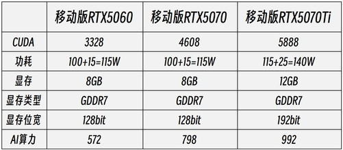 首先看一下三款显卡的核心规格。移动版RTX5060拥有3328个CUDA核心,最高功耗为100+15=115W,显存8GBGDDR7,显存位宽128bit;移动版RTX5070与其很相似,CUDA核心升级到4608个,其他保持一致。从这一点能够看出,两者的定位是相似的,属于正常的阶梯性能提升。移动版RTX5070Ti明显更高一档,CUDA核心为5888个,但功耗进一步上升到115+25=140W,显存容量也更大,为12GBGDDR7,显存位宽也升级为192bit。从核心参数的对比就能够看出,移动版RTX5070Ti要明显更高一档。